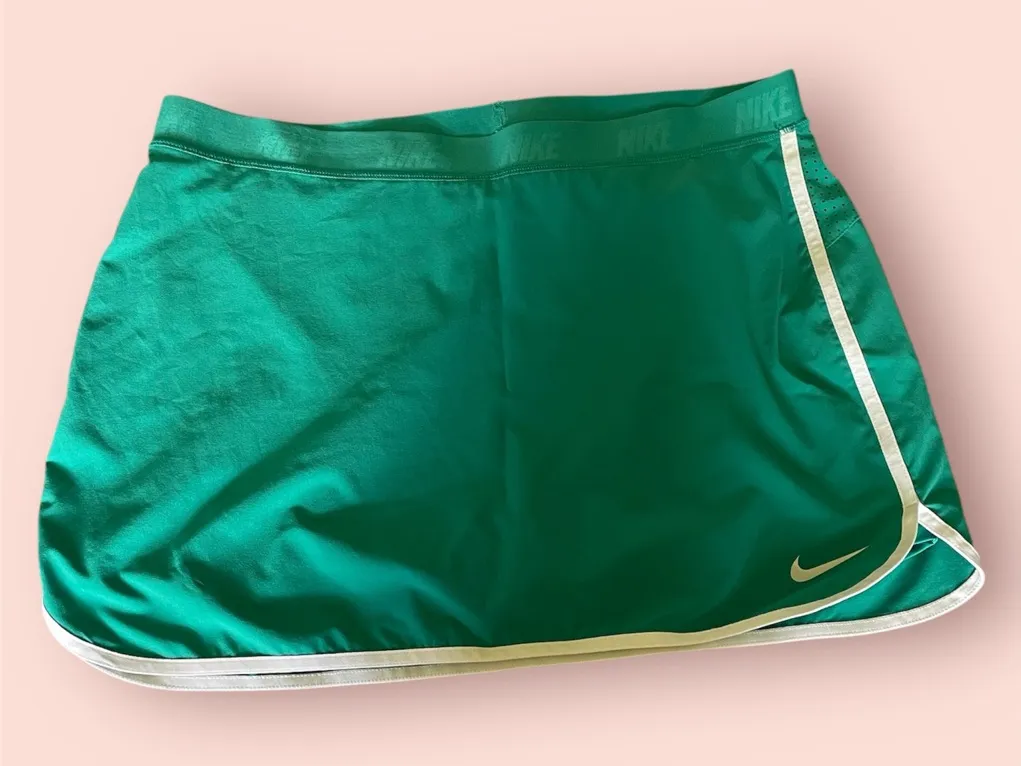 Emerald green Nike skirt featuring sleek white accents. Ideal for active and casual wear.