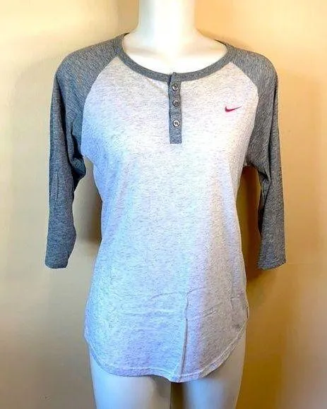 Nike Henley top. Grey Heather and light grey heather. Hot pink swoosh. Shown on a small model. T... Show more