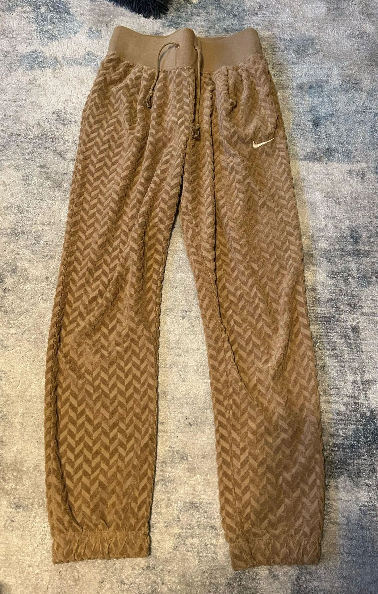 Super comfy almost waffle material Little on the longer side More high waisted