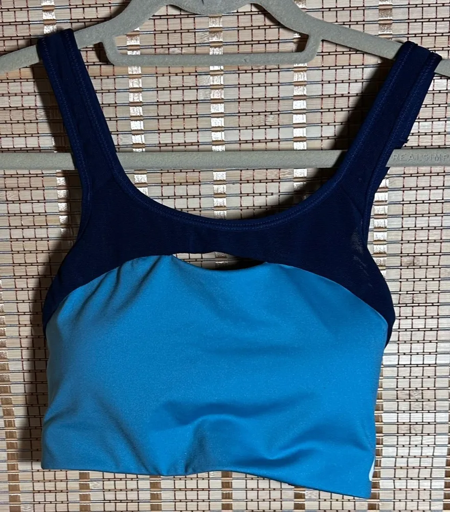Keyhole front cut, cross cross back straps, and Nike logo across back band. Med Support. Fits 36D-... Show more