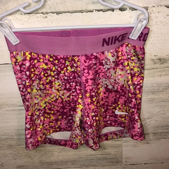 Nike printed spandex shorts yellow and pink in color size small workout shorts In pre used conditio... Show more