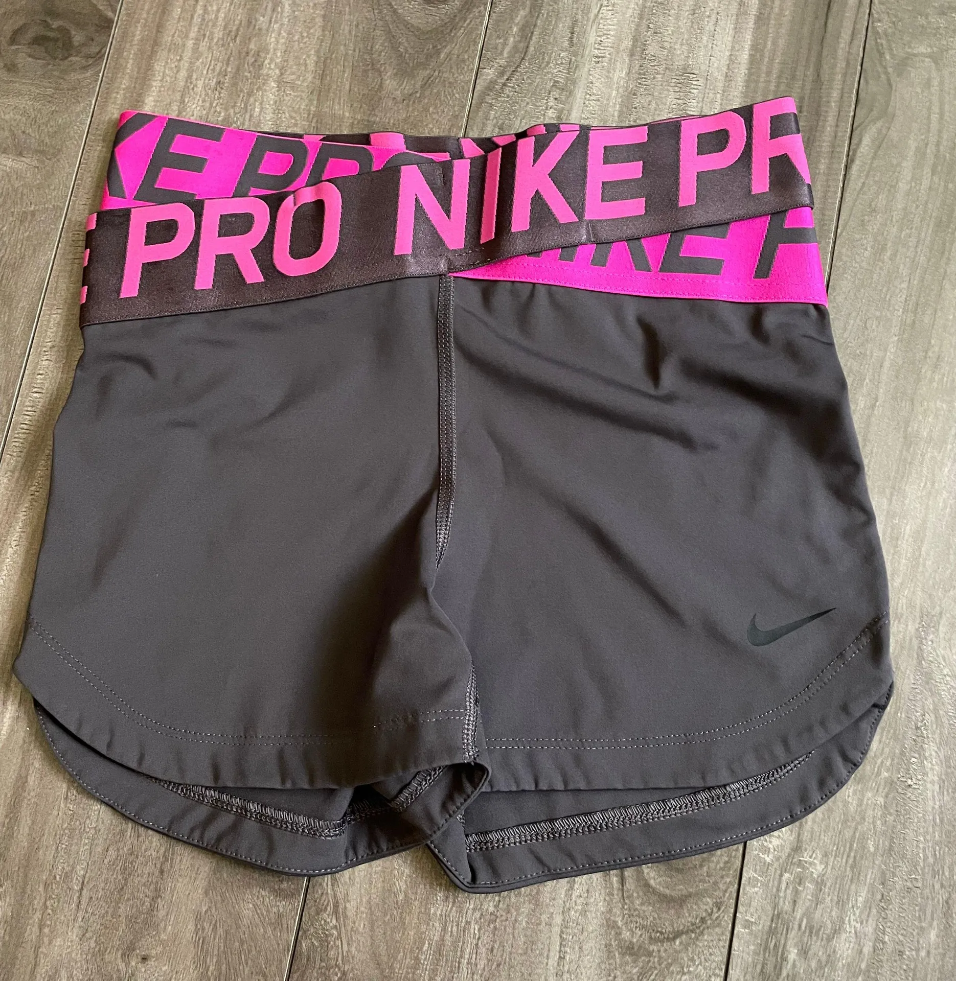 Super cute Nike pro shorts In great condition These are a dark grey and pink color It’s a Nike pro c... Show more