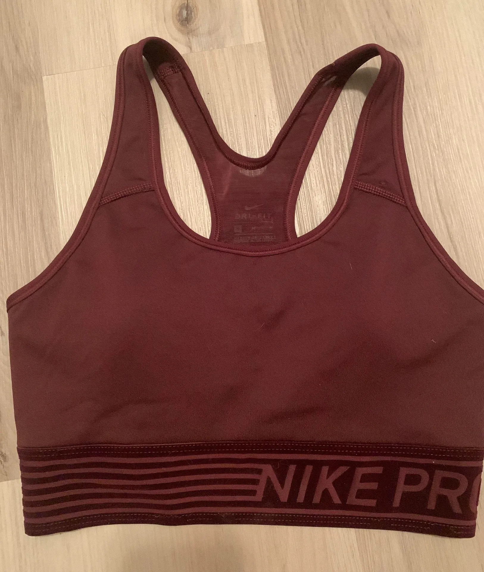 Super cute maroon colored sports bra by Nike Pro. Only worn a couple of times and very supportive! H... Show more
