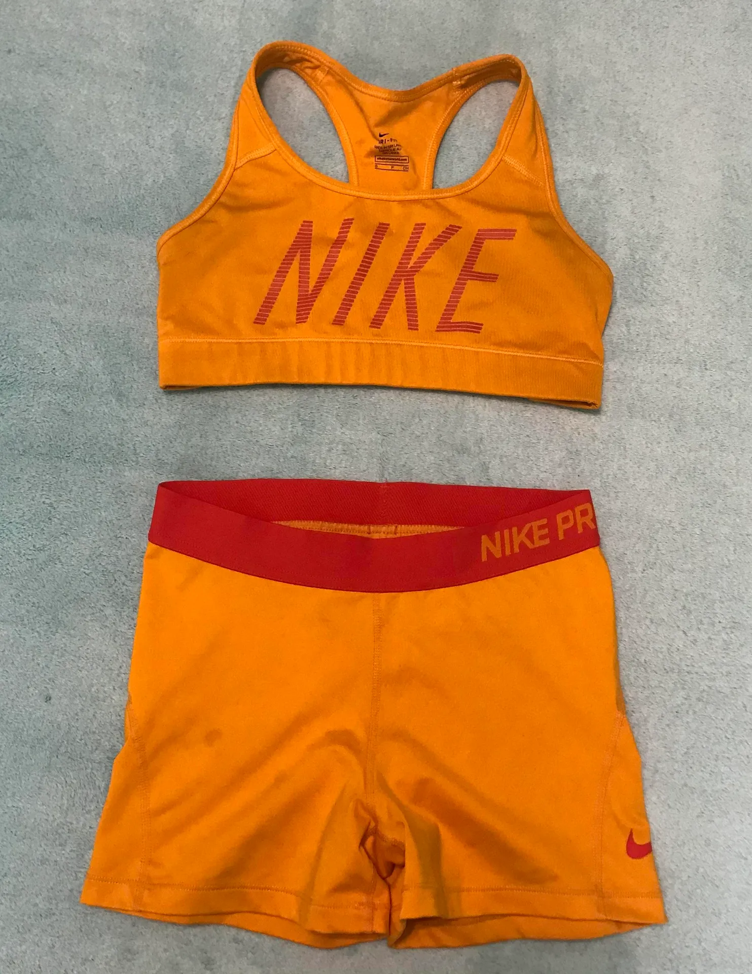 Nike Pro sports bra and spandex set! Orange and pink, size small. Good condition, worn a few times