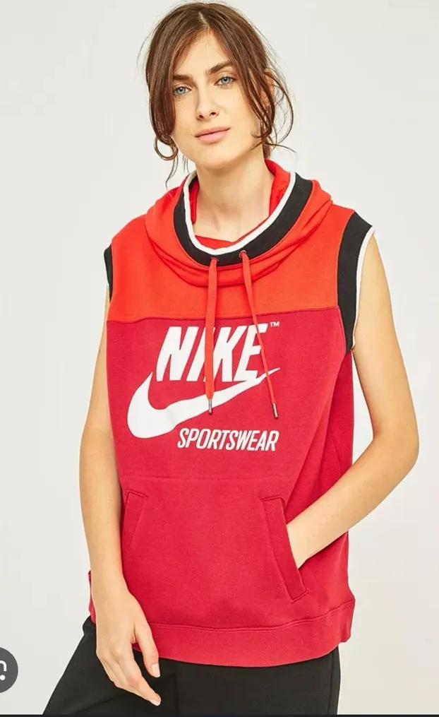 Bold red sleeveless top with Nike branding. Features a cozy hood and front pocket.