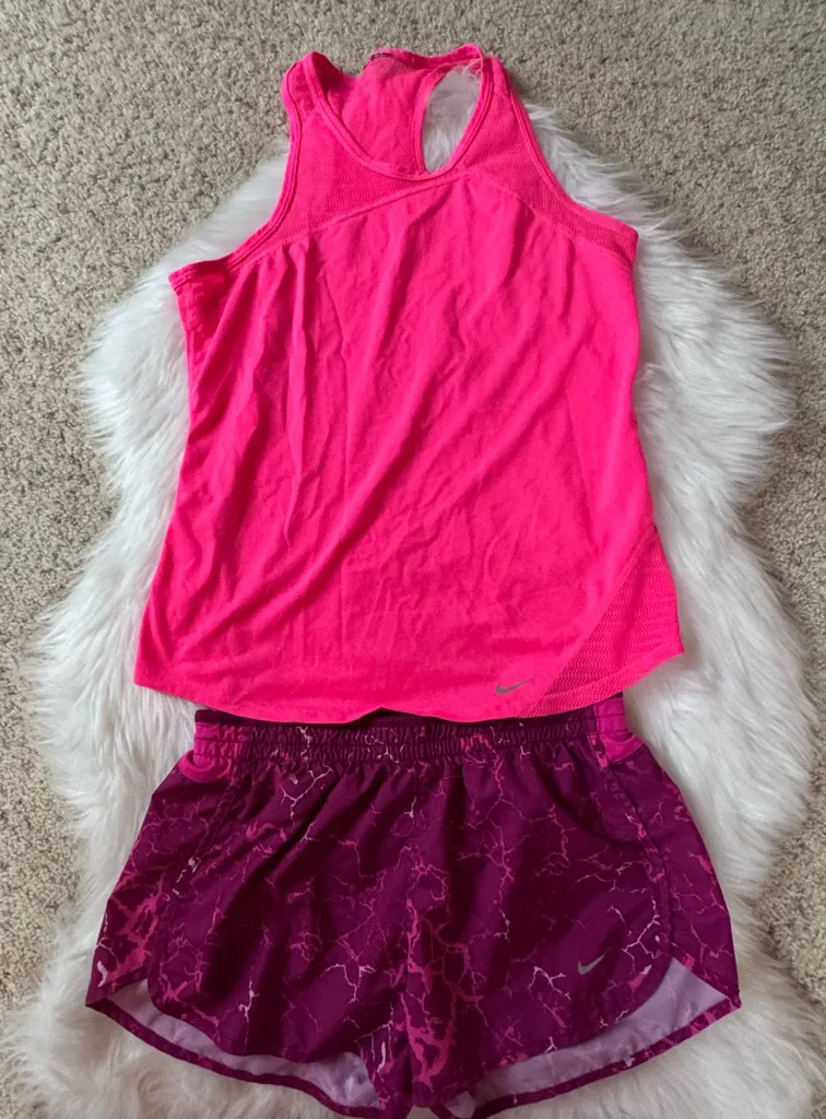 VGUC. Bright pink Nike tank top paired with vibrant dark and light pink crackle lined shorts. Some... Show more