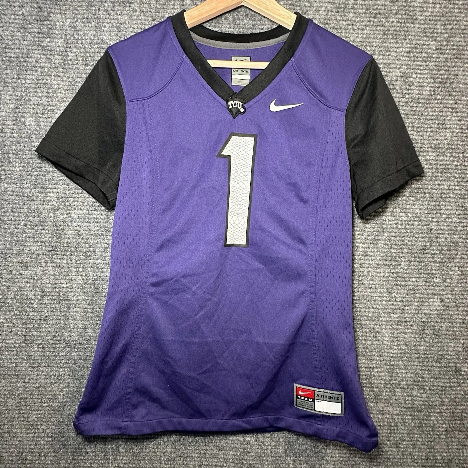 The product is a Nike Texas Christian TCU Horned Frogs Purple Jersey #1 in women's size small. This... Show more