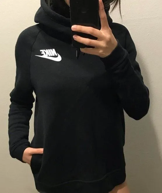 The sweatshirt is black wore once has a white nike sign and white check