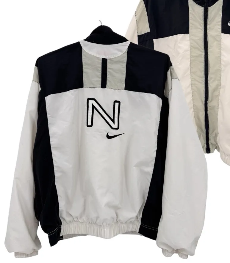 Nike Vintage 90s Y2K Windbreaker Track Suit Jacket. Ivory, gray and black colorblock with large stit... Show more