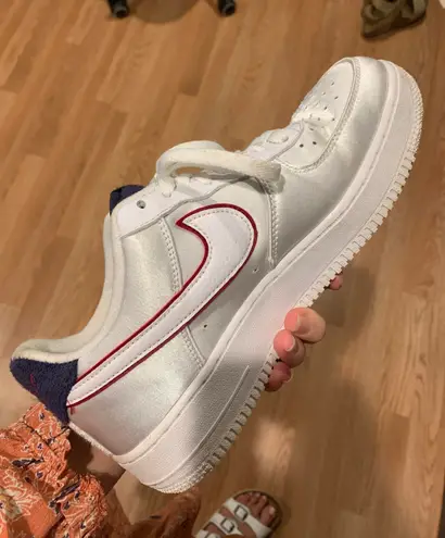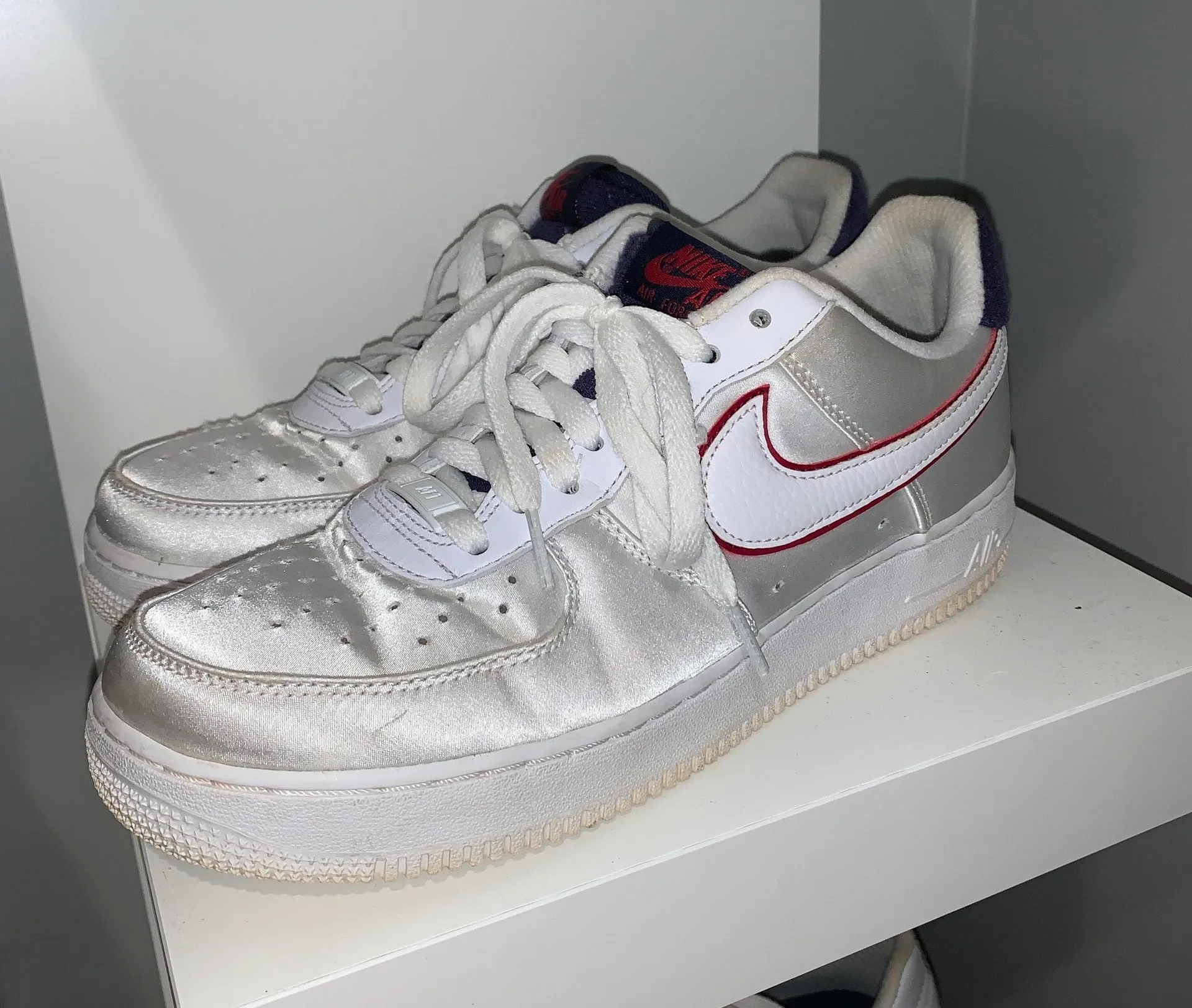 satin af1 with navy and red lightly worn some creasing but i’m sure you could get them out no stains