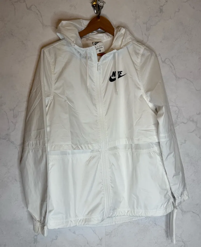 Nike white hooded rain coat wind breaker Size xs Gently used - last photo shows some small marks... Show more