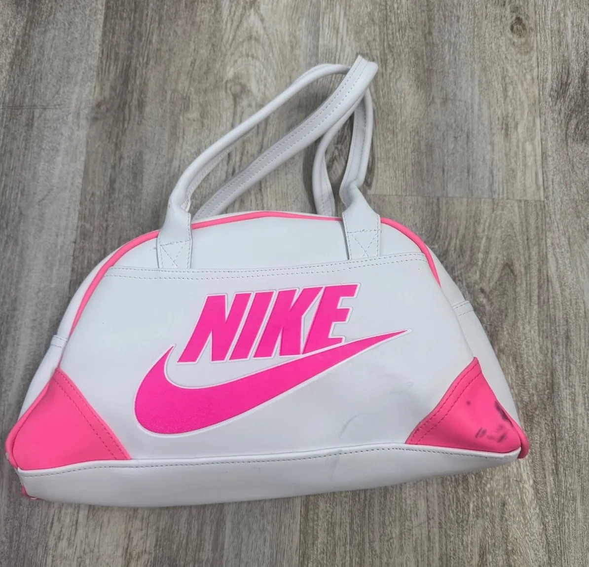 Nike women's duffel bag in white with vibrant pink accents. This sporty bag features the iconic Nike... Show more