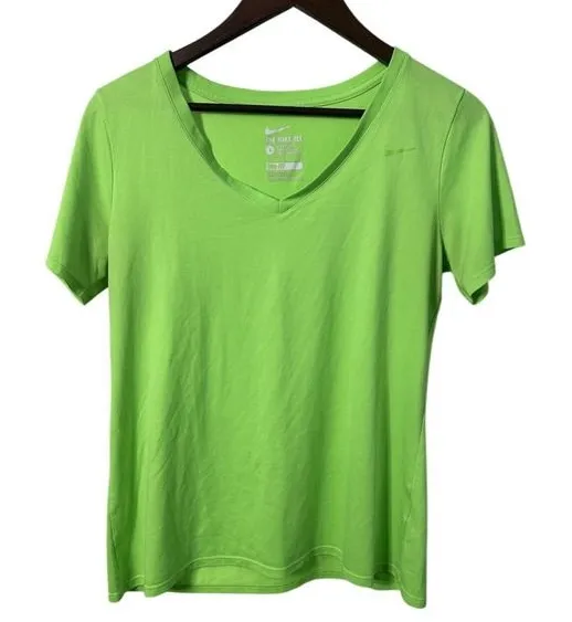 Nike Dri-FIT athletic cut t-shirt in a vibrant bright green. This tee features a classic V-neckline... Show more