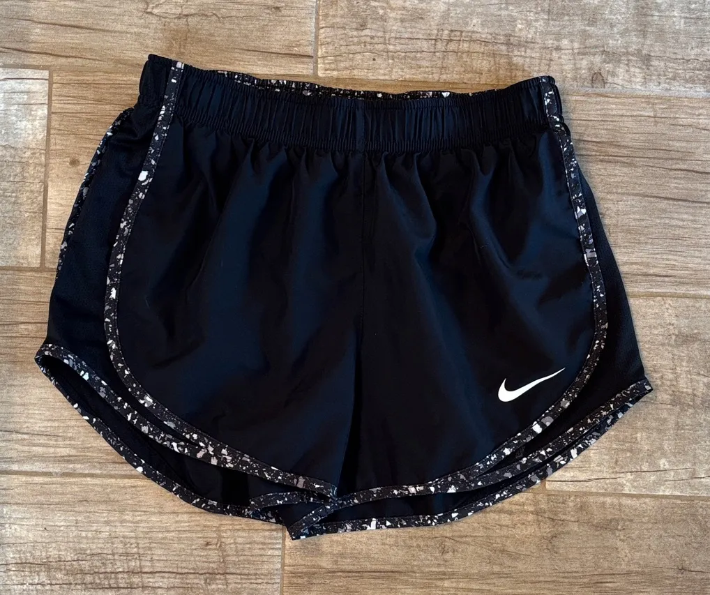 Item: Dri Fit Nike black shorts with stylish patterned trim. Ideal for workouts. Size: Tag missing-... Show more