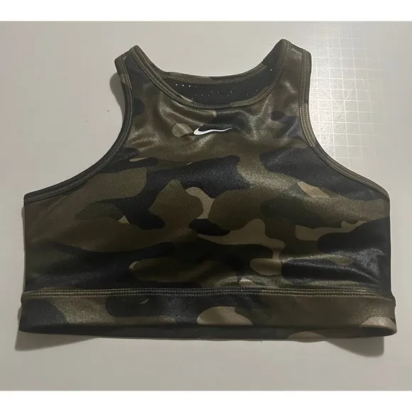 Nike Women's Dri-Fit Sports Bra High-Neck Green Camo Swoosh Logo Size XS Medium support Removable... Show more