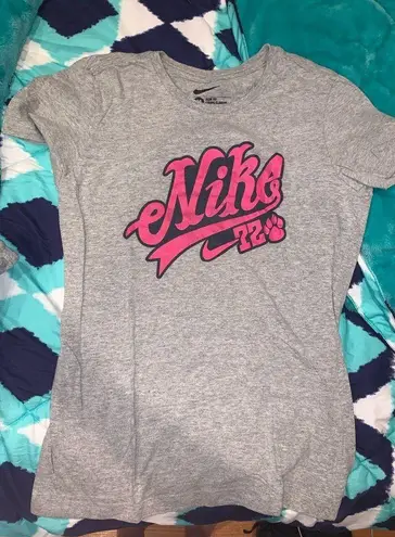 Stylish gray tee featuring a vibrant pink Nike graphic. Perfect for everyday wear.