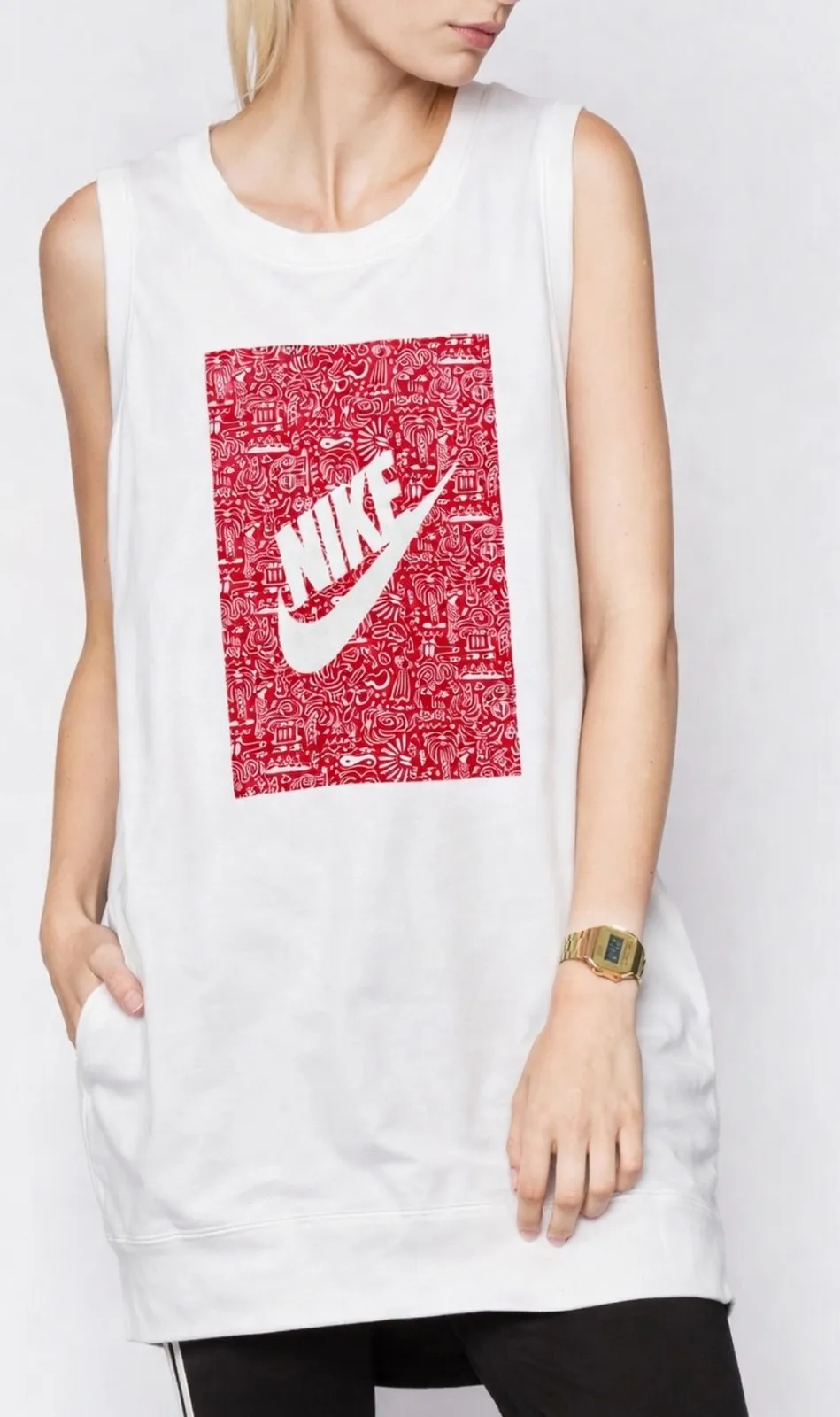 Nike women's sleeveless tank top dress in white featuring a bold red graphic print of the iconic Nik... Show more