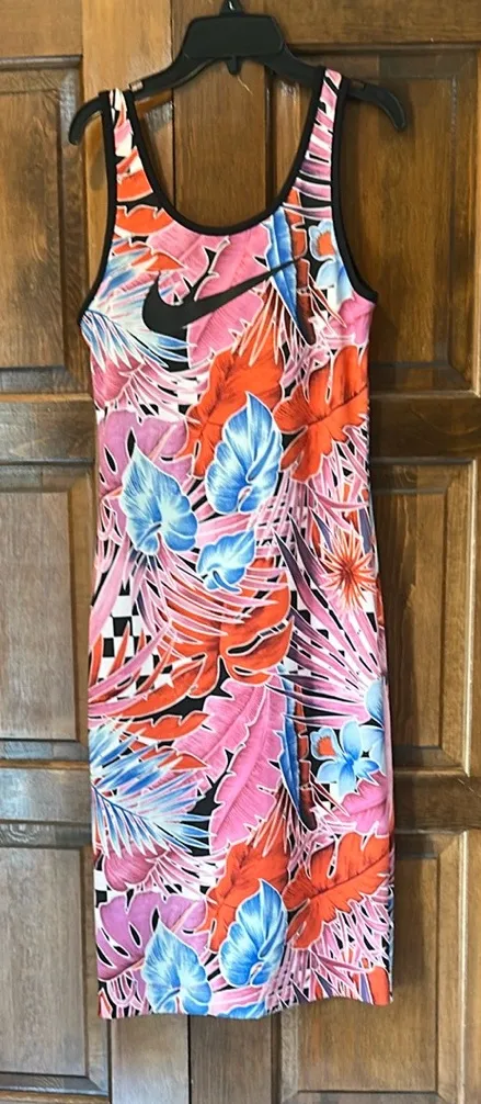 Stand out with this Nike midi dress. Features bold leaf patterns in pink, blue, and orange. Perfect... Show more