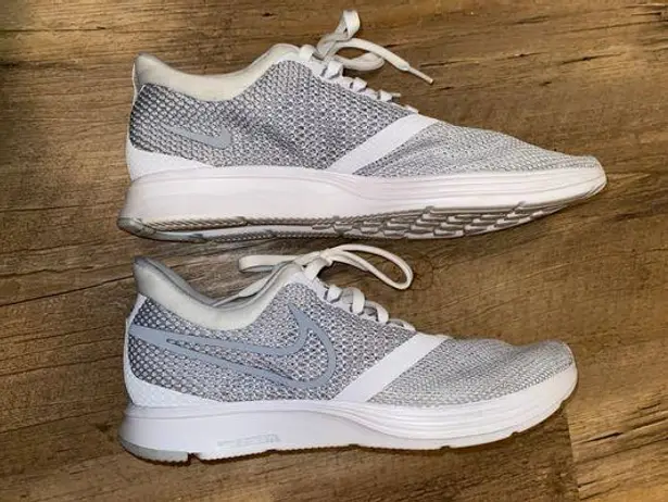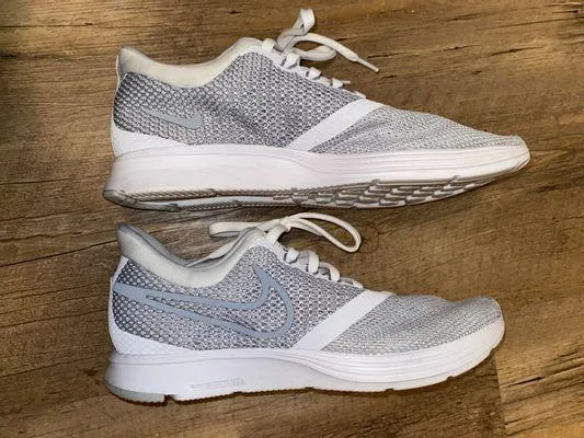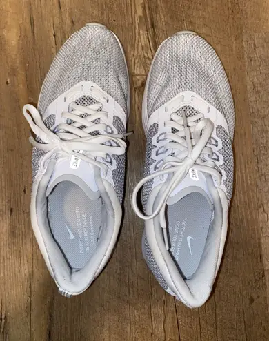 These Nikes are a size 9, they are silver and white, and they have only been worn twice! They are in... Show more