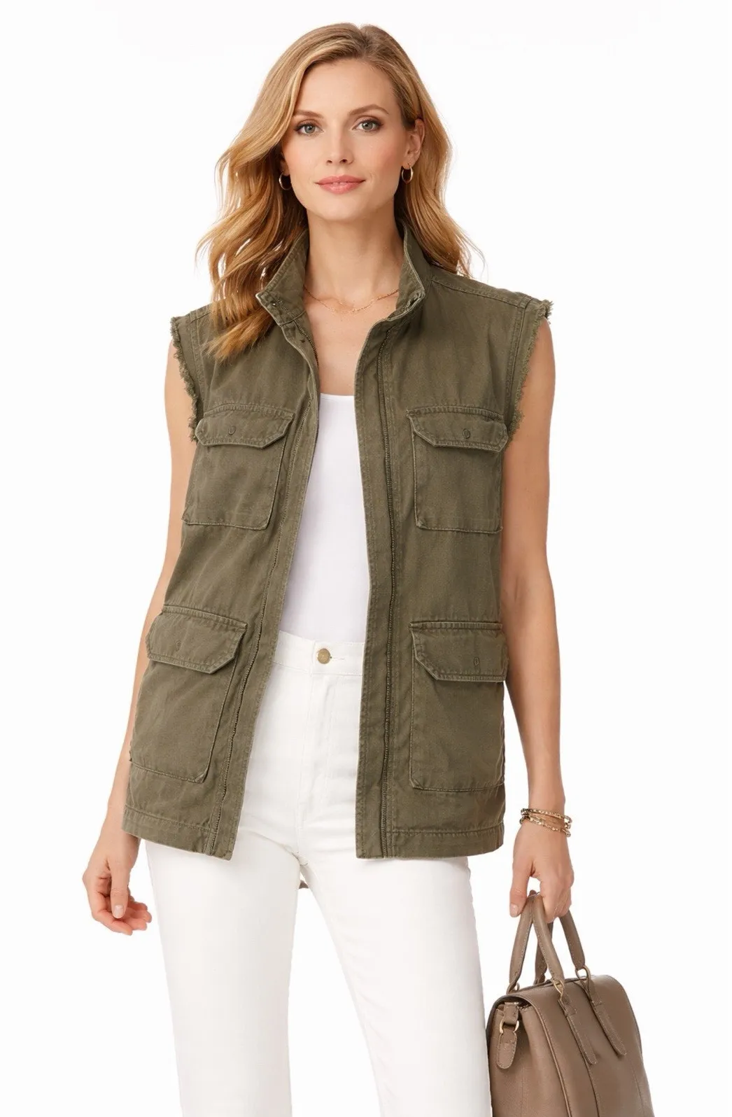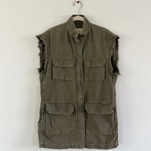 Effortlessly cool with a utilitarian edge, this Nili Lotan Army Green Utility Vest is crafted from structured denim and designed with clean lines and functional detailing. The army green hue and minimalist silhouette reflect Nili Lotan’s signature understated, military inspired aesthetic! Details: * Army green color way * Utility style vest * Raw hem arm holes * Functional front pockets * Structured yet wearable fit * Excellent condition * Fabric contents: 78% cotton, 22% linen * Size 4 Approximate Measurements: * Pit to pit-18.5” * Length-29.5”