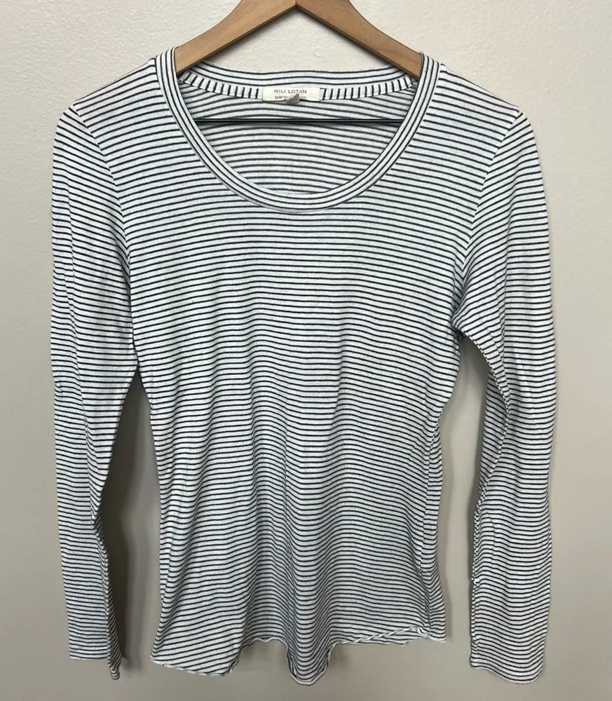 Nili Lotan Long Sleeved Striped Cotton Shirt Size Small Black and White Stripes Scoop Rounded Crew Neck Intentionally worn in, favorite tee feel Rounded rolled hem excellent condition 17.5” chest 24.5 long