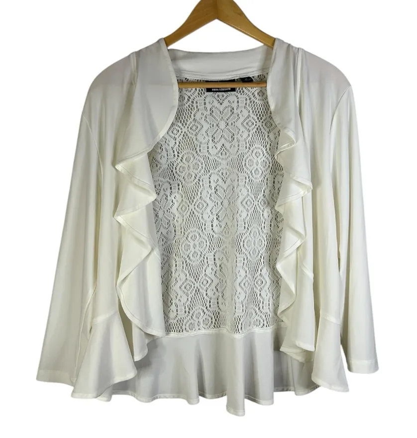 Lennie for Nina Leonard Ivory Bolero Shrug with a Whimsical bohemian/lagenlook waterfall hem that drapes the bodice for a flowy layered fit. Gently worn, size XL Cottagecore, light academia, bohemian, beachwear, cropped cardigans, crochet tops
