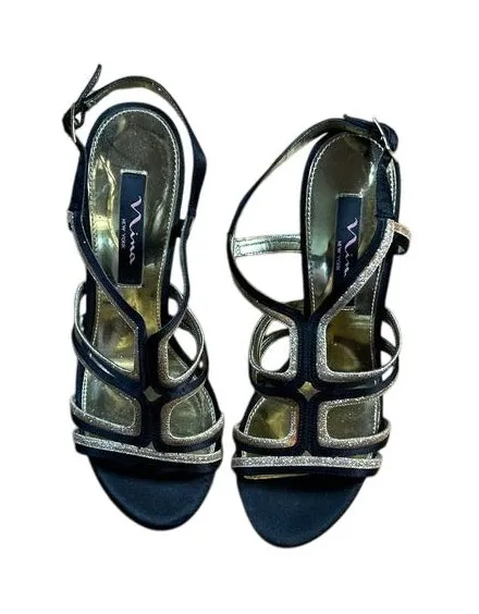 Make a stunning entrance at any formal event with these sophisticated strappy sandals. The delicate glitter-trimmed straps create an eye-catching geometric pattern, while the sleek silhouette offers timeless elegance. Perfect for weddings, galas, proms, or any special occasion where you want to dance the night away in style. Keywords: strappy sandals, evening shoes, formal footwear, glitter trim, party shoes, wedding shoes, prom shoes, black sandals, silver trim, geometric design, dressy sandals, special occasion