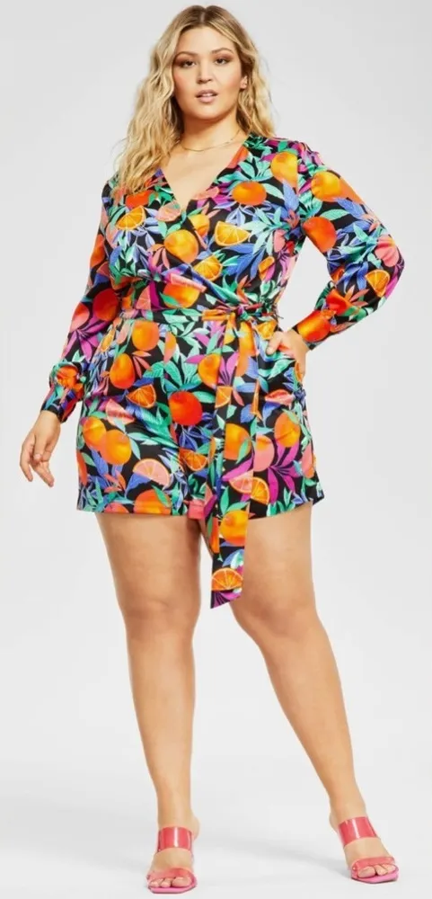 Vibrant and fun, this plus size long sleeve satin romper from Nina Parker takes on floral print with bright and bold colors. Side pockets Removable belt Back zipper Elastic back waistband