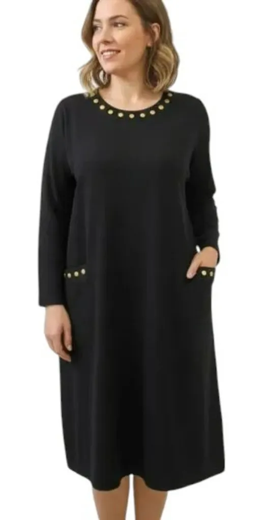 Brand: Nina Patrick Size: L Color: Black with gold accents Condition: Excellent used condition Flaws: None Material / Care: 70% Acrylic, 30% Wool Blend / Dry clean only Features: Back zip closure, gold decorative snap accents on neckline, cuffs & pockets, soft knit fabric, timeless little black dress silhouette Fit: Relaxed oversized silhouette with dropped dolman sleeves Measurements: Pit to Pit: 27" | Length: 38" Perfect For: Holiday parties, date nights, fall/winter events, casual styling with boots Notes: Vintage 80s/90s piece, statement hardware adds luxe appeal Aesthetic/Style Keywords: Cozy, statement, vintage, classic, preppy Please Note: Actual item shown. Colors may vary slightly due to lighting. #0600