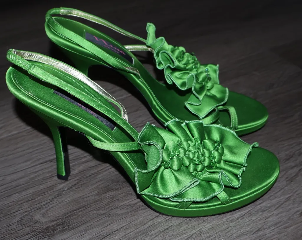 In excellent condition Size 8 1/2 classic, glamorous party or bridal shoe Color:A rich, vibrant Emerald or Apple Green Main Material: High-sheen Satin with a leather sole Heel High heel 4” Key Detail: A large, elaborate ruffled or pleated satin rosette/flower appliqué over the toe strap. Embellishment:A cluster of tone-on-tone green beads or crystals at the center of the ruffle on the right shoe Straps:Thin, delicate strappy design, including a slingback strap.
