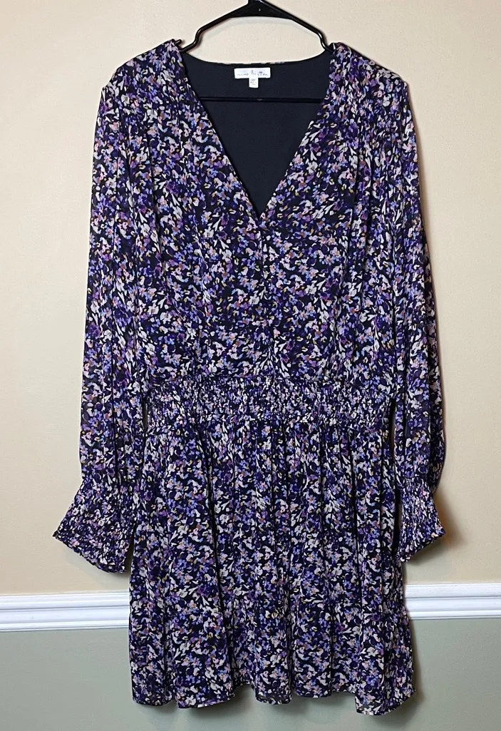 Excellent condition. 100% Polyester. V-neck. Various shades of purple, black, pink, white, blue, and orange. Fabric button-closures on upper front. Smocked waist and sleeve cuffs. Sheer sleeves. Lined body. Approximate measurements: Pit to pit - 25” Shoulder to bottom hem - 39” Waist across - 18” (can be stretched to 20”)