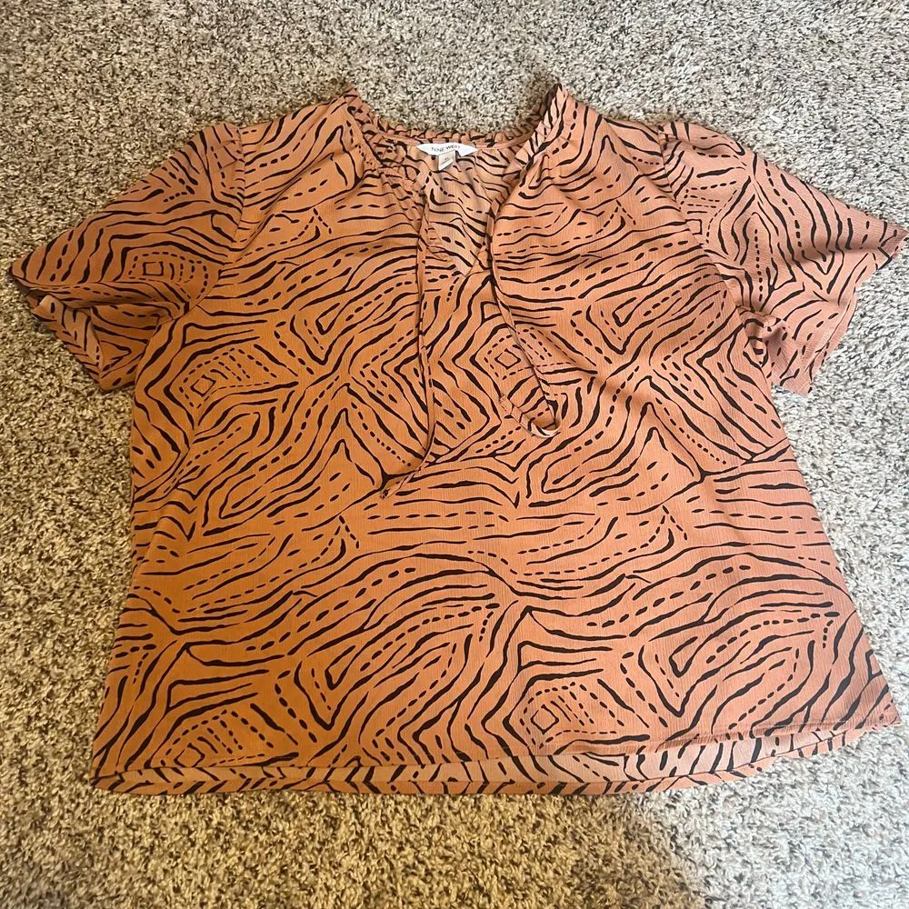 Stylish Nine West blouse featuring a striking abstract tiger stripe pattern in brown and black. V-ne... Show more