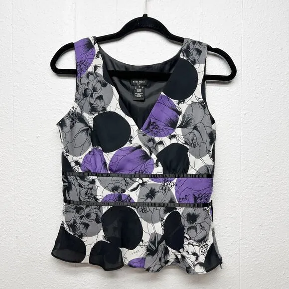 Nine West women's floral top in white, purple, gray, and black. Cross over v-neck. Sleeveless. Accen... Show more