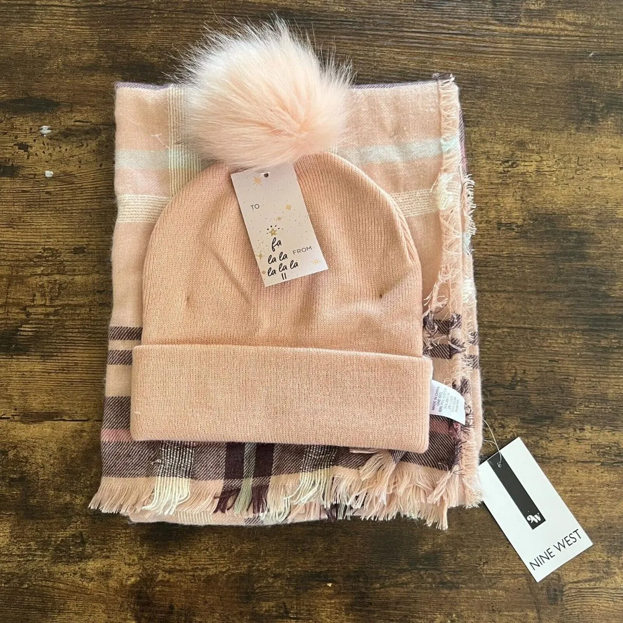Nine West Wrap Scarf and Faux fur Pom Beanie set Winter Hat Pink Plaid Christmas.