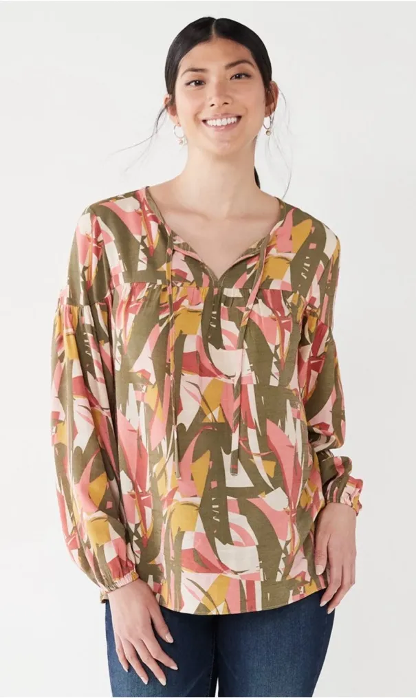 Multicolor shirred long sleeve v neck blouse peasant size XS Measurements are approximate Pit to... Show more