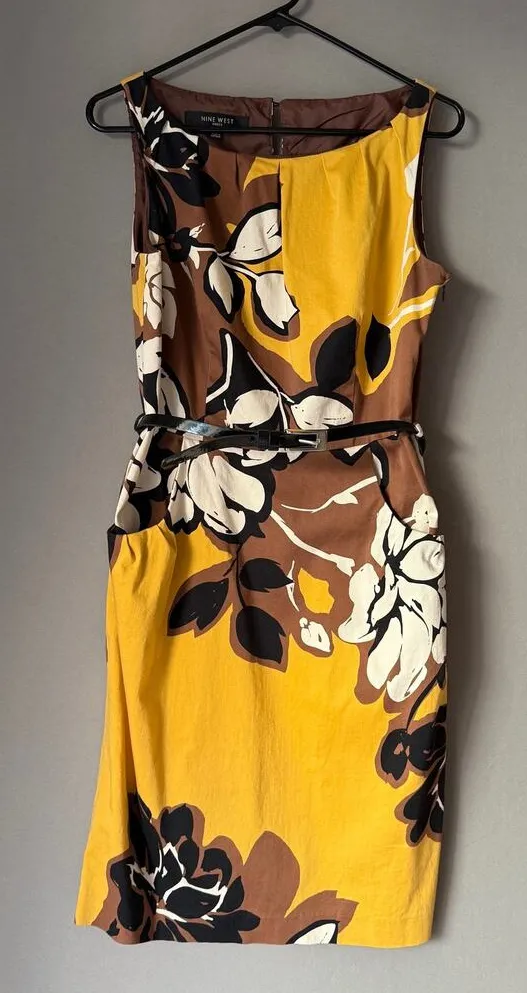 Nine West sz 10 Yellow Brown belted floral sheath dress Gently used with no flaws. Has pockets. Th... Show more