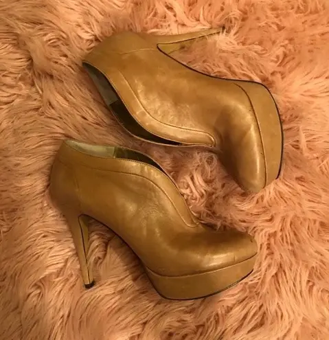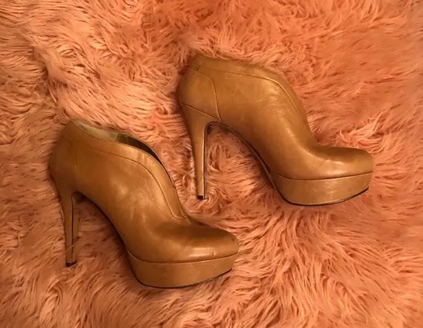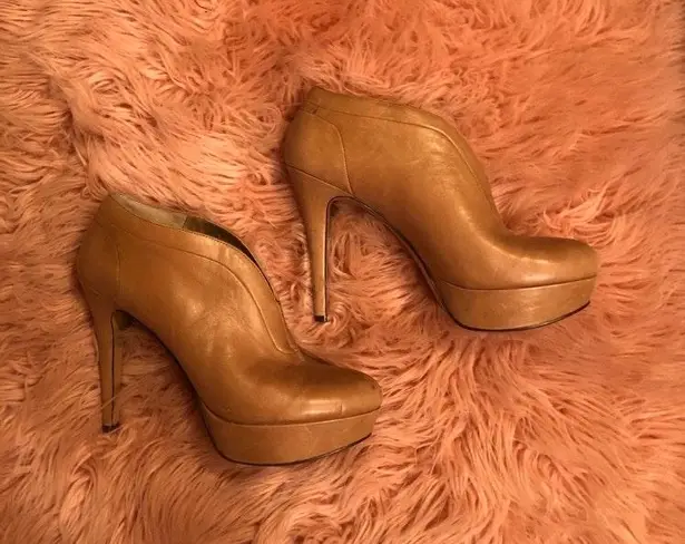 Tan closed platform heels with 4 inch heel and 2 inch platform. Size 7 M. Lightly worn and in good c... Show more