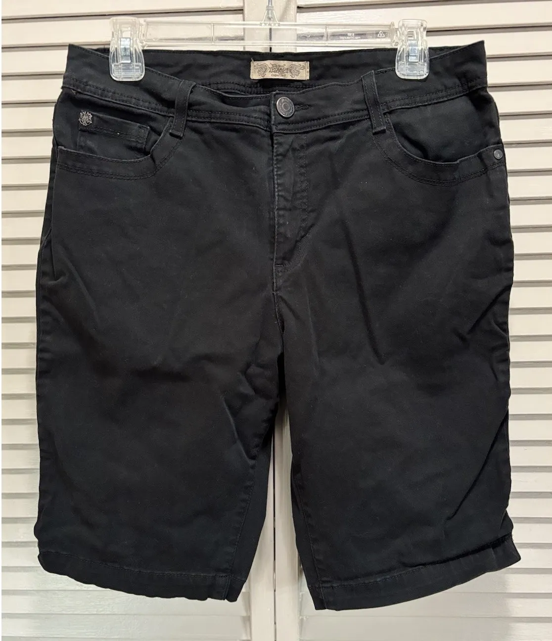 The product is a pair of Nine West Vintage Black Bermuda Denim Jean Shorts in size 14, with a mid-ri... Show more