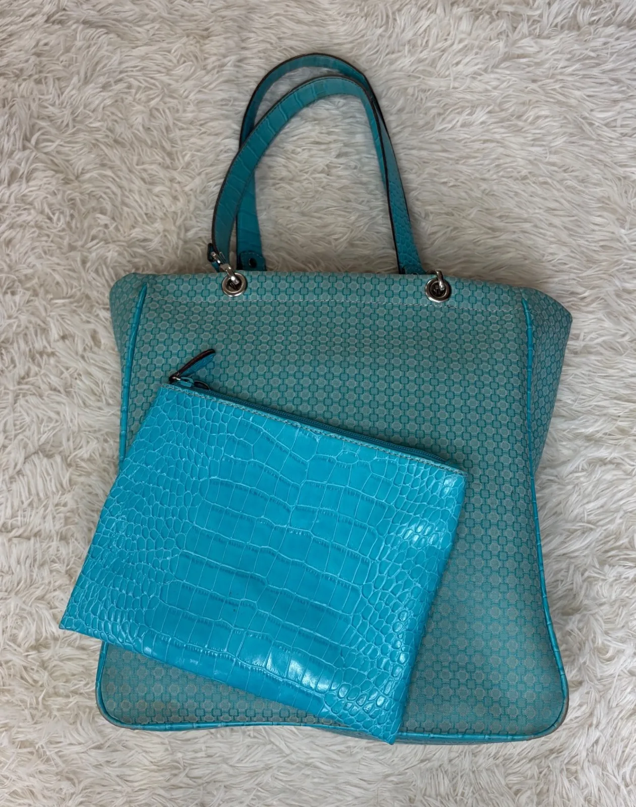 Turquoise dreams unfold with this striking tote bag, where functionality meets high-fashion flair. Imagine yourself effortlessly navigating through your day with this statement piece, a true conversation starter that complements any outfit. The eye-catching teal hue is accentuated by a unique textured pattern on the main bag, offering a subtle yet sophisticated touch. Complementing this is a removable crocodile embossed pouch, perfect for keeping your essentials organized and within easy reach. The sturdy straps and spacious interior make it ideal for work, weekend getaways, or adding a pop of color to your everyday errands.