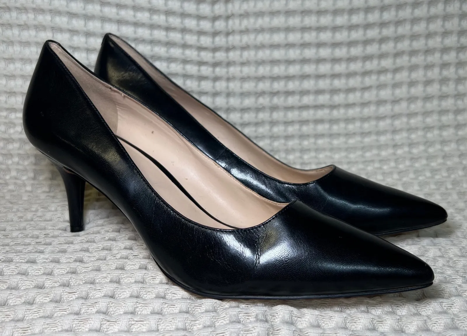 Nine West Margot black leather pointed toe stiletto heels. These elegant heels feature a classic po... Show more