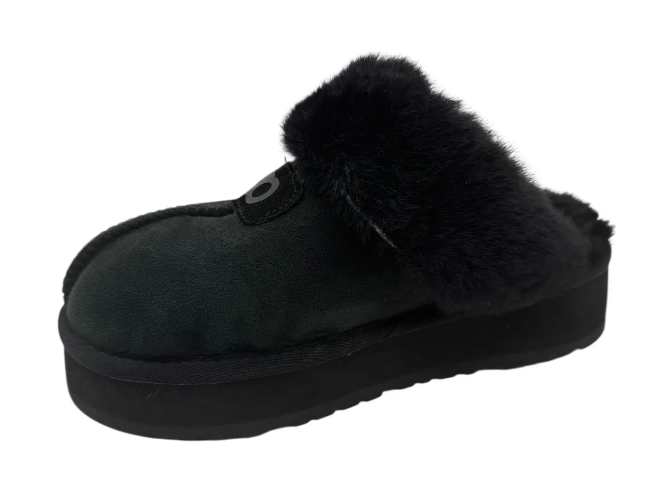 NINO Brand suede mules in black with plush faux fur trim and a comfortable platform sole. These roun... Show more