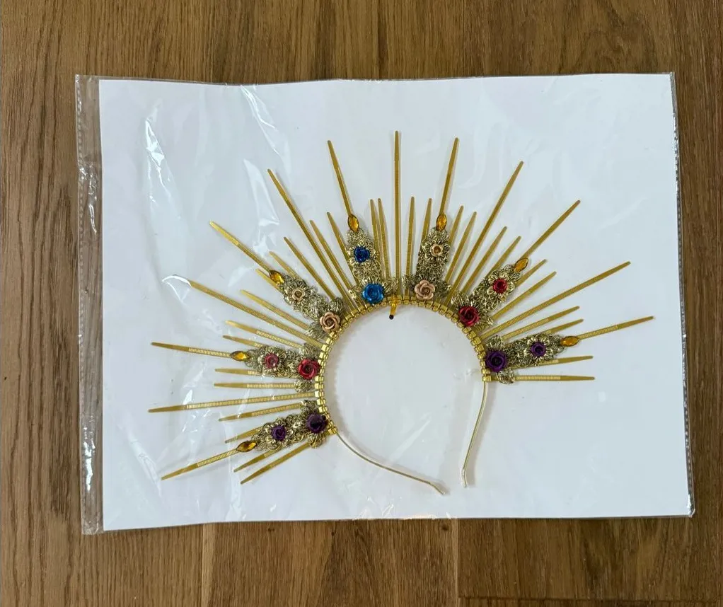 New in package, gold tone, metal day of the dead costume style sunburst Mary goddess style, headband or crown. Perfect as a costume accessory or just for when you’re feeling a little extra. The gold town spikes radiate from the headband and our punctuated with gold tone, filigree, and metal rosette in purple, red, champagne, gold, and royal blue punctuated with Amber color Marquise rhinestones. Slay.