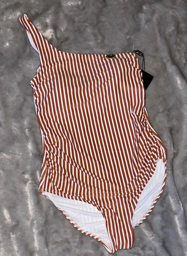 Make a splash in this chic one-shoulder striped swimsuit from Nip Tuck Swim x Naturally With Im, designed to flatter and support with a specialized blend of molded cups, spacer fabric, and powermesh shaping. The elegant reddish-brown and white vertical stripes elongate the silhouette, while the high-cut leg and asymmetrical neckline add modern flair. ✨ Features: One-shoulder design for a sleek, asymmetrical look Vertical stripes in sand tones for a slimming effect Molded multi-fit cups for versatile bust support Powermesh lining to shape and streamline High-cut leg for elongation Brand new with tags 📌 Details: Brand: Nip Tuck Swim / Naturally With Im Size: US6 / AUS10 Color: Sand (reddish-brown and white stripes) Condition: New with tags Material: 85% Nylon, 15% Spandex (with powermesh) Designed in: Sydney, Australia Made in: China Style: One-piece, one-shoulder, shaping swimwear
