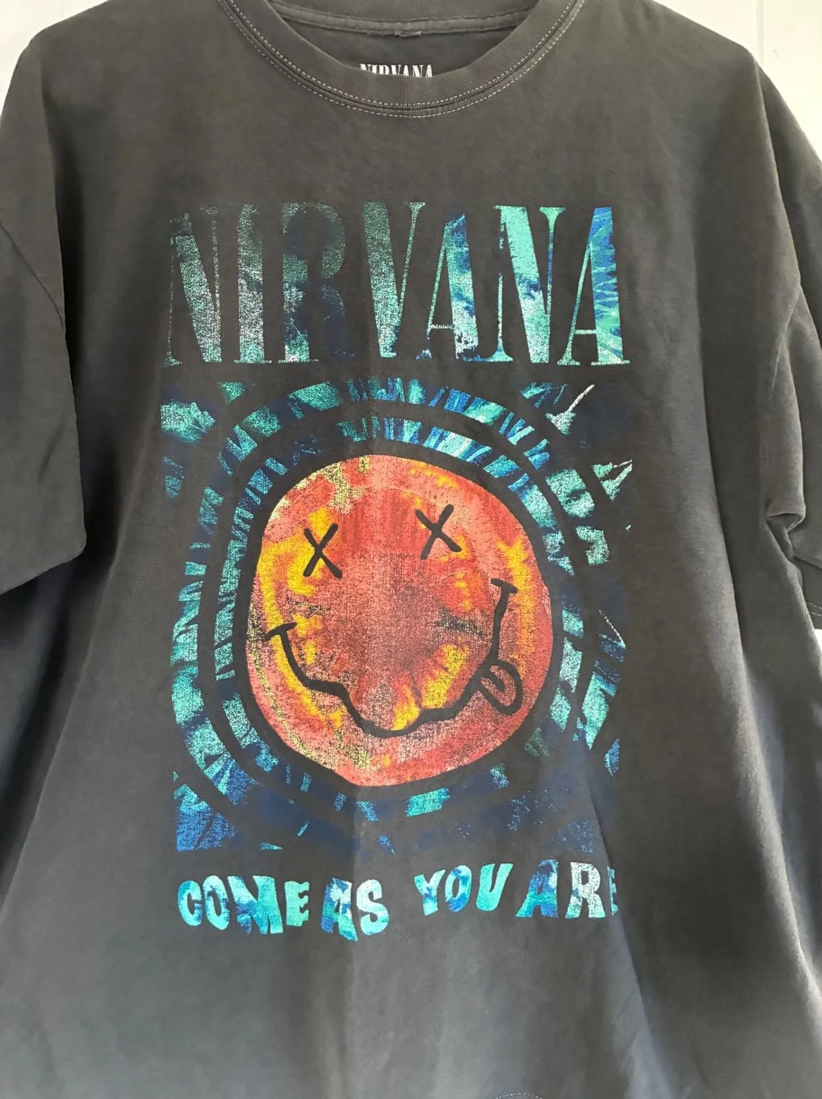 Measurements: • Chest: 22 in • Length: 29 in Type Keywords: Nirvana, Smiley Face, Graphic Tee, Rock Band, Grunge, Music Merch, Vintage Style, Casual, Oversized, Streetwear, Concert Tee