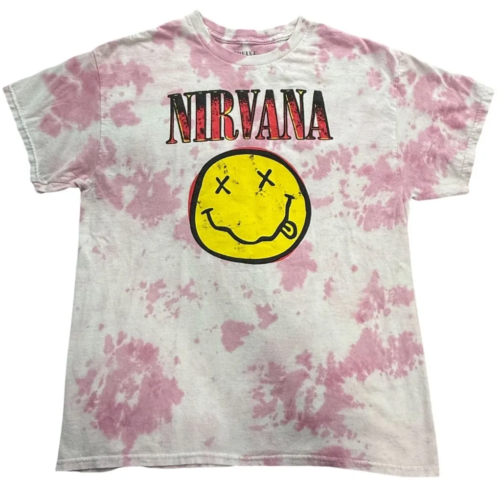 Nirvana T-Shirt Womens Large Smiley Yelllow Graphic Pink Tie Dye Retro Grunge Band Music Festival Good Pre-owned condition. *Small spot on back that blends with tie dye print. Hard to see, please see pic. • 100% Cotton • Crew Neck - Tagless • Short Sleeves • Pink & White Tie Dye • Yellow Nirvana Smiley Graphic Print - Unisex tee Approx measurements - see pics: Length = 27 inches Pit to Pit = 21 inches across flat *Items smoke/pet free. Offers always considered! Bundle for better prices! Item#1289