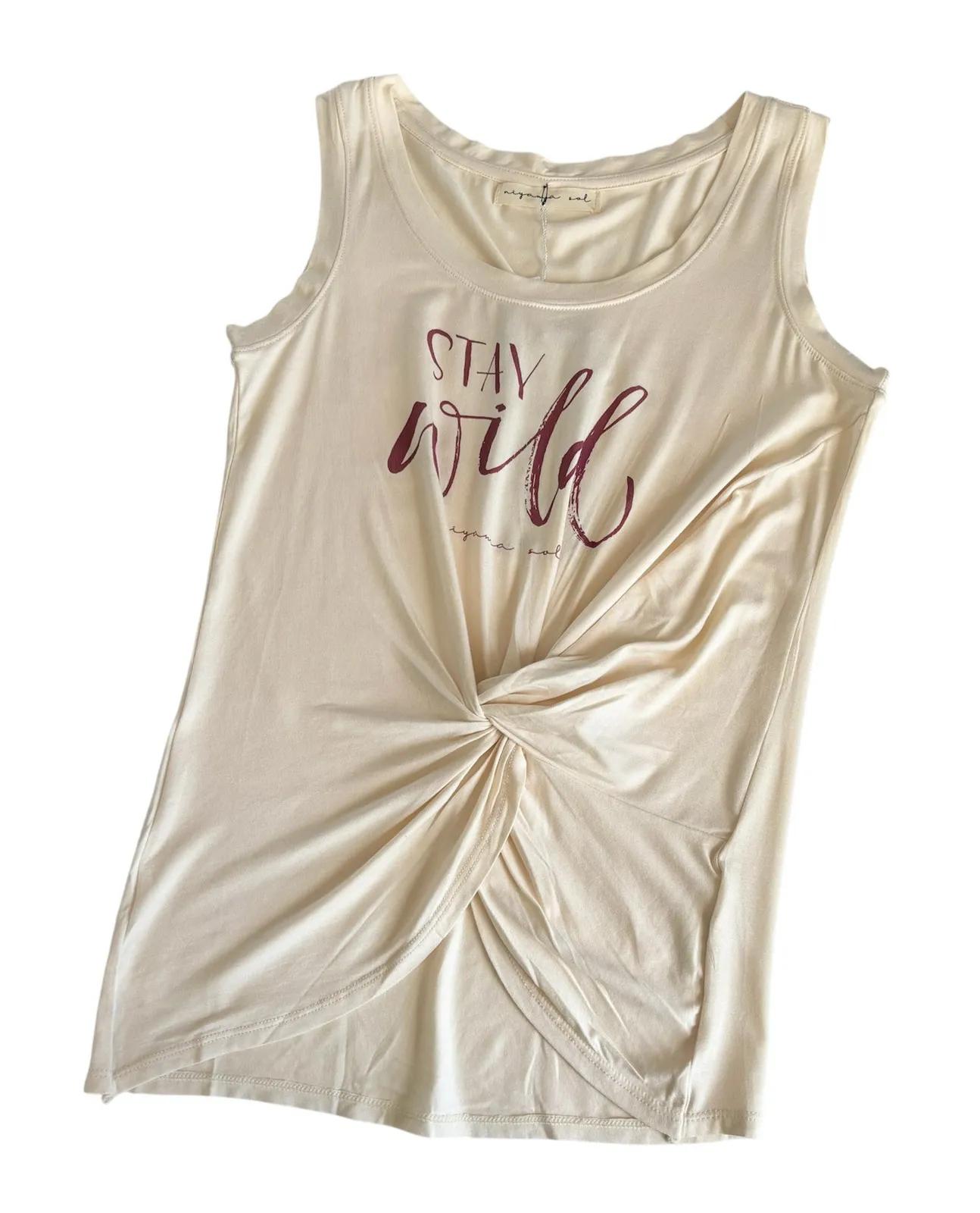 Features: Niyama Sol Stay Wild Cream Twist Front Athletic Tank Top; round neckline, 95% viscose/5% spandex Size: extra small Condition: New with tags gifts for her, casual, chic, relaxed, stylish, trendy, feminine, bohemian, athleisure, athletic, loungewear, summer, spring