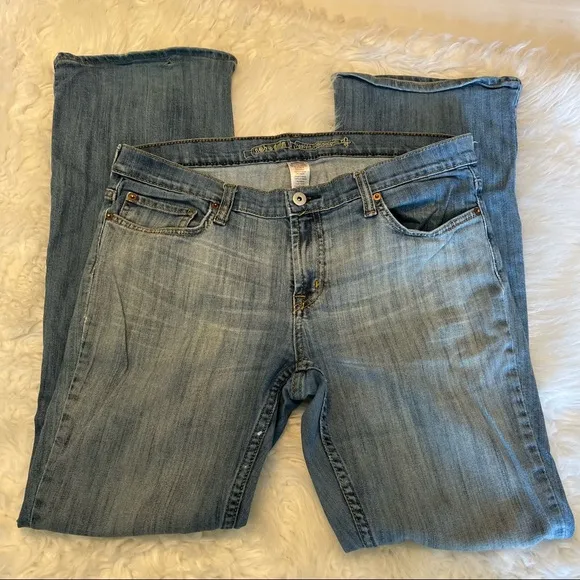Free with any purchase Have a small hole on the butt area. Could patch or use as DIY fabric Cotton spandex blend Not sure if these are bootcut or flare. They have a wider bottom Relaxed through the hip area