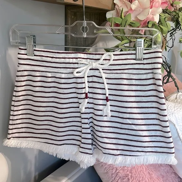 beach striped knit stretchy elastic waist drawstring waist rope belt Inseam is approximately 3 i... Show more