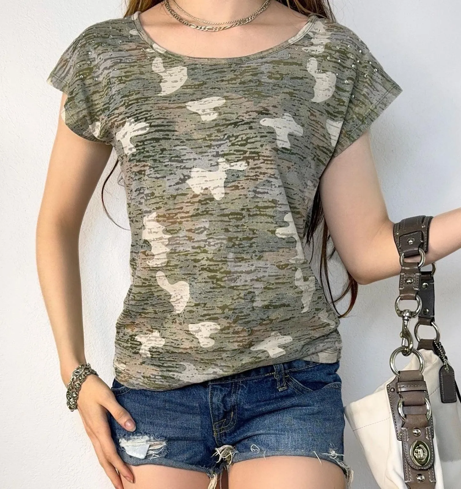 Camo Tee Shirt Semi Sheer Burn Out Rhinestones No Boundaries Size Medium, Good Condition Measureme... Show more