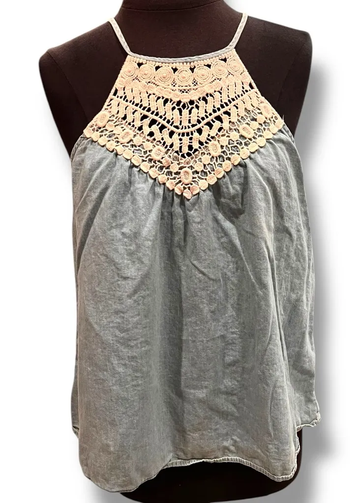 chambray tank top Crochet lace front inlays Keyhole button closure on back 100% cotton Size medi... Show more